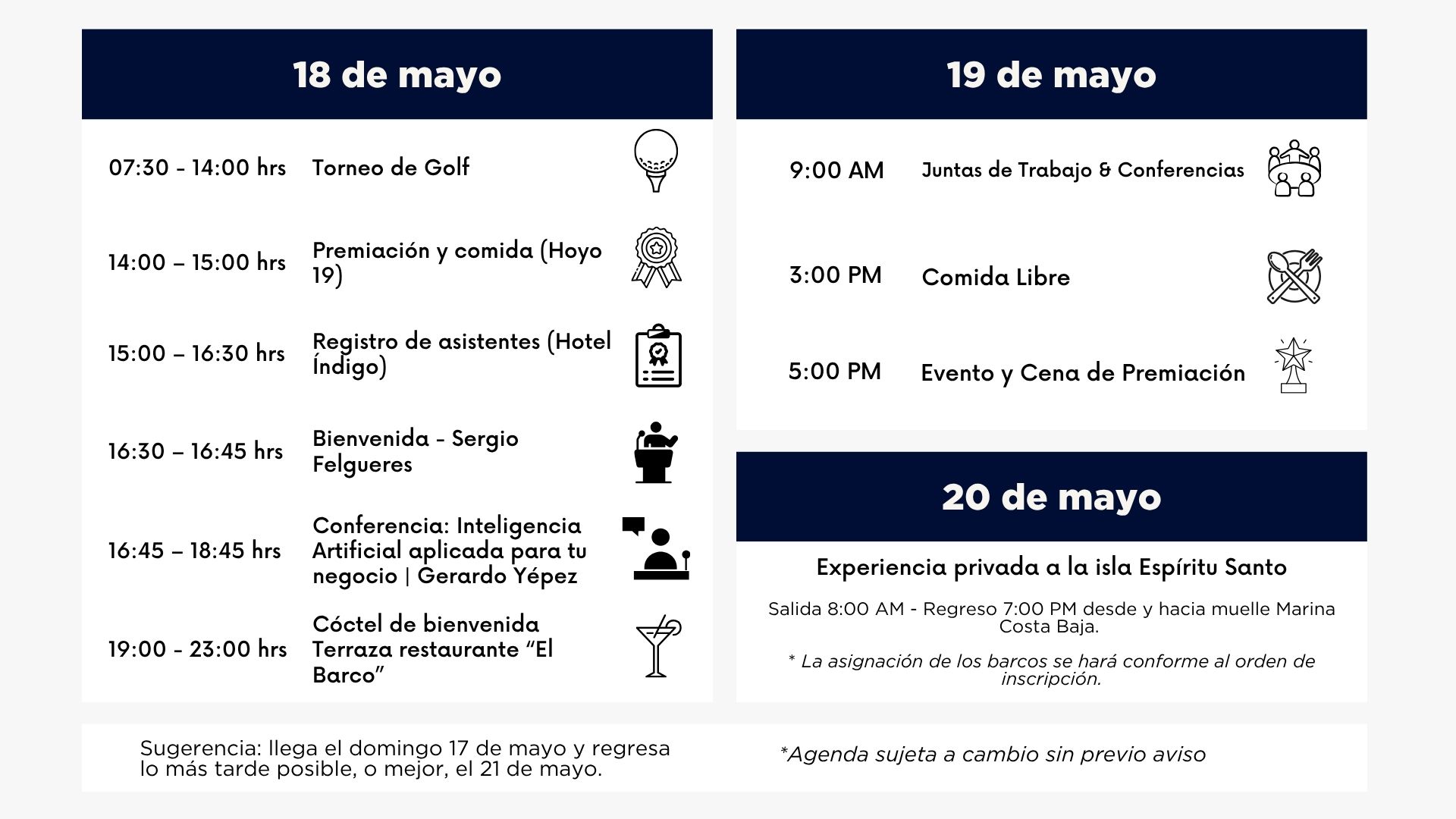 Incluye: coctel de bienvenida, conferencias, cena de premiación y experiencia privada a Isla Espíritu Santo